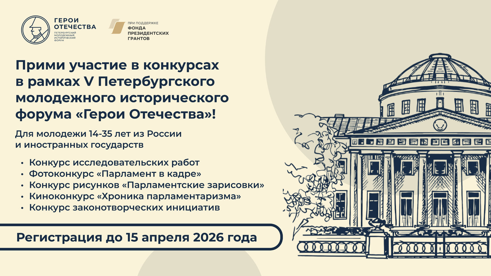Открыта регистрация на конкурсы в рамках V Петербургского молодёжного исторического форума «Герои Отечества», который состоится в середине мая 2026 года в Санкт-Петербурге — северной столице России.